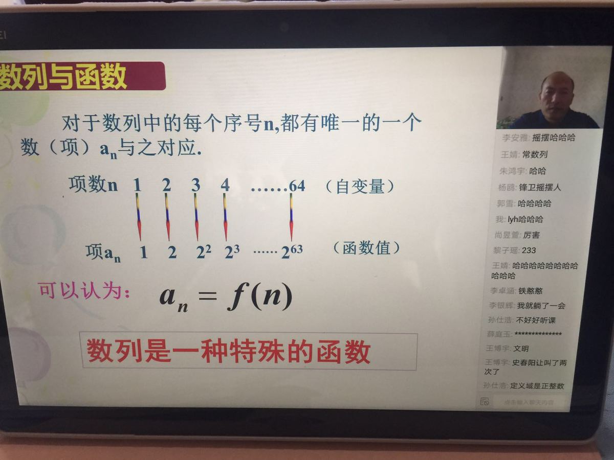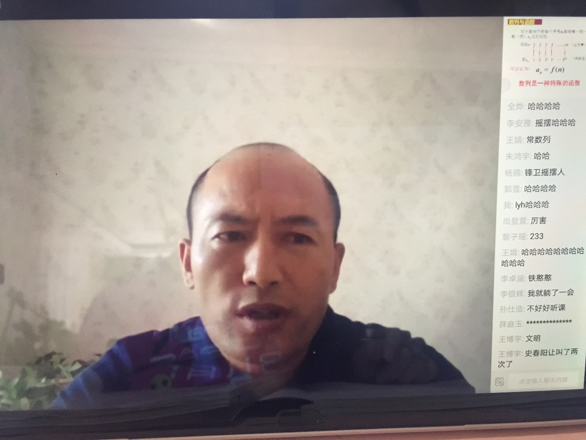 在直播视频中,苗阳坐在书桌前,对摄像头举着教案,大声讲解:“什么叫数列……”过去,他在黑板前为学生授课和答疑,现在,他面前是一个小小的摄像头。