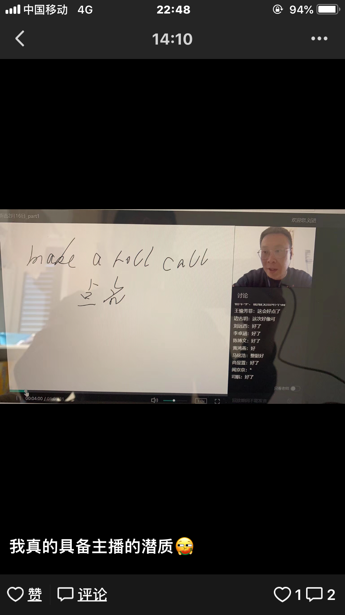 总算那一刻来临了,刚开始,一个假期都没咋说英语,刘进调侃说自己嘴里还有点拌不过来,学生在讨论区时不时就发来一些有趣的评论。慢慢的,他逐渐进入状态,各种表请,神采飞扬,与学生的互动也是锦上添花,不知不觉中,一个小时匆匆而过。点了下课,刘进就迫不及待地发了个朋友圈,还坚信自己是一个有潜质的主播!