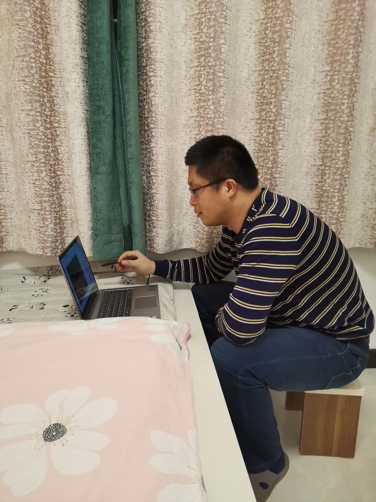 今天直播时间,学校安排给熊志刚的时间是下午17:20分,他直播时,为了避开儿子的打扰,把电脑搬到了阴面的一个小卧室,坐在墙角的小凳子上,打开电脑给孩子们上课。