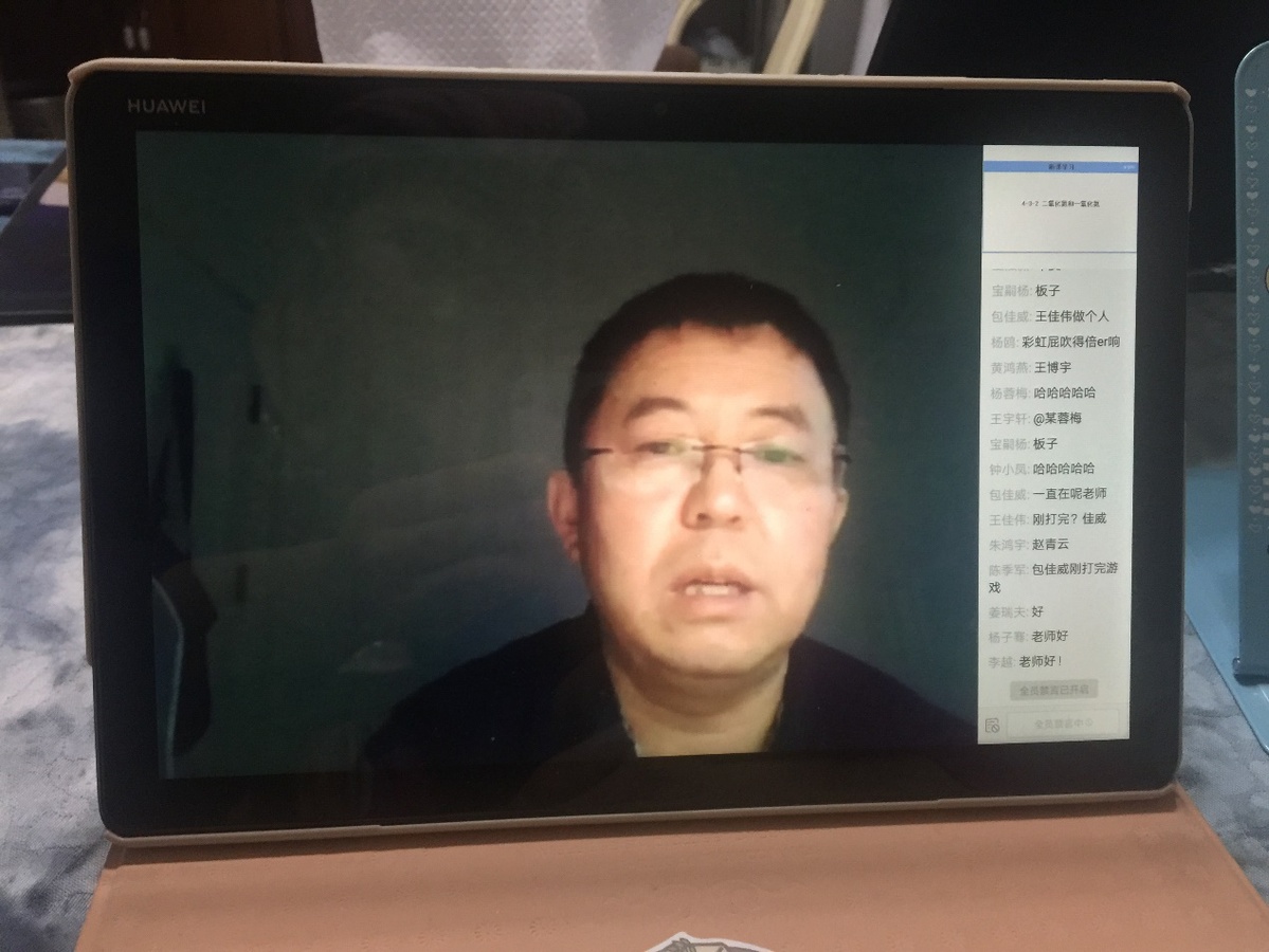 “很久没有上讲台了,今天又是我平生第一次的空中课堂,为了讲好第一课,我找了十几份资料按照我的思路做成了一个完整的课件,用两个电脑直播!怕说错,另一部电脑提示文字,一部电脑直播!,”