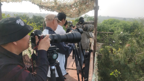 (图为摄影爱好者在观鸟台捕抓镜头。摄影:洪兵)