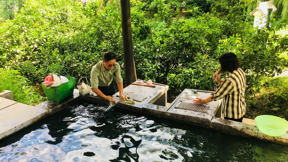 在上包村,我走进洗衣房,只见大门上方高悬着村书记包立成写的“浣衣坊”三个大字的牌匾,门两边还张贴着:“不染琴池水,仍闻衣杵声”的门联,洗衣房内设有洗衣槽、水龙头、搓衣板、分类垃圾桶等,对洗涤废水统一处理,亭廊还能遮阳避雨,成为山村的一道风景。