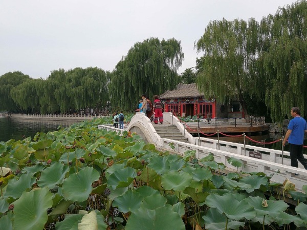 出了烟袋斜街不远处便是前海和后海之间的银锭桥,因有镂空云花栏板和翠瓶卷花望柱形似银锭故名。站在银锭桥上,可以环顾两个海子,顺着西北极远处水面延伸的天际线便是朦胧中的远山。夏日的傍晚,站在桥上,晚霞洒落前海和后海,水天相映,自是美不胜收。