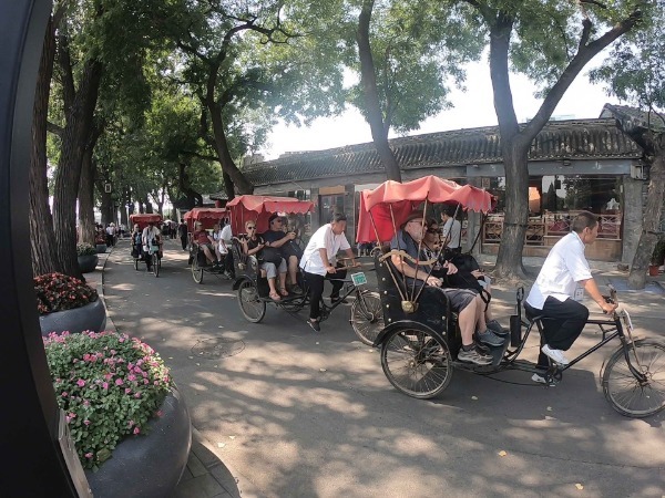 外国旅游者在什刹海后海北沿乘坐人力车游览。鞠传江摄影