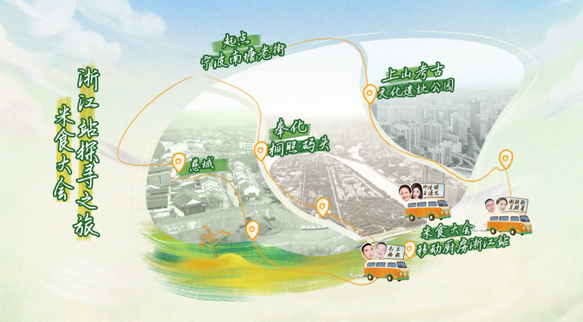 “水满田畴稻叶齐,日光穿树晓烟低。”“稻田万顷如棋局,”“菰米新炊滑上匙”。在浙江站,“米食寻味团”打卡了宁波南塘老街、慈城古镇、浦江上山遗址、奉化桐照码头、余姚梁弄镇、湖州南浔古镇等地点,探寻品味冻米糖、梁弄大糕、米豆腐、慈城年糕、湖州粽子等米食制作全过程。另外,节目组还邀请当地民众分享以上美食的习俗故事。