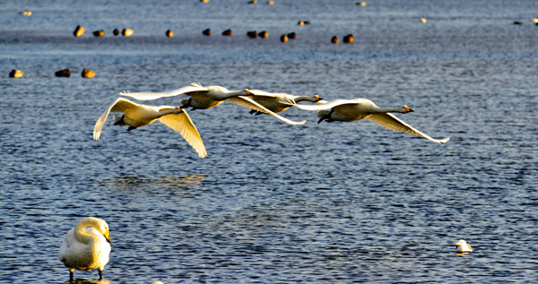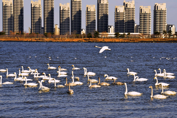 大天鹅仪态优雅,栖息于海滨、湖泊、水库及沼泽湿地,是世界上飞得最高的鸟类之一,成年天鹅体重超过7公斤,舒展开宽大的翅膀长度会超过1.5米,迁徙时飞行高度超过8000米。每年3至4月间,它们大群地从这里飞向北方,在中国北部边疆、俄罗斯等地产卵繁殖,10中旬,天鹅群会结队南迁。