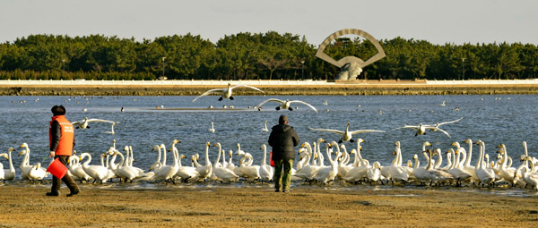 “喂食可以弥补天鹅野外觅食的不足,还可以增进野生天鹅与人类的亲近感。”张健说。