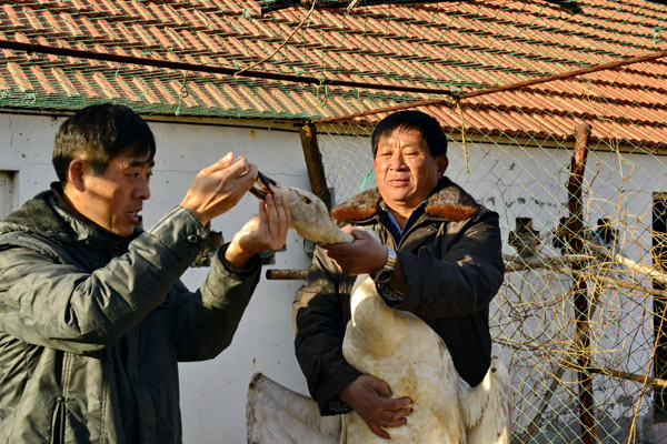 大天鹅保护站的工作人员在给生病的大天鹅喂药 鞠传江 摄影