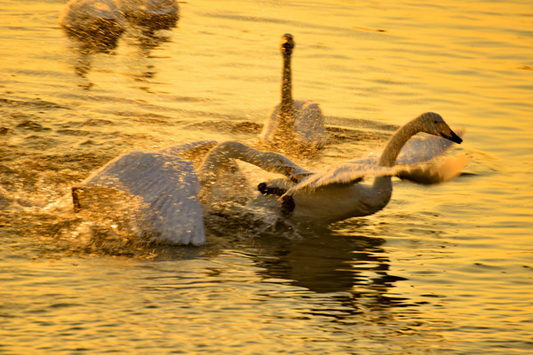 清晨,天鹅会在浅水区对羽毛进行反复梳理、清洗,然后展翅挥舞。当两个天鹅家庭为争食物会一起展翅仰天大声鸣叫,或者相互追逐撕咬。此时,岸边的摄影师们就会响起一片“咔咔”的拍照声。
