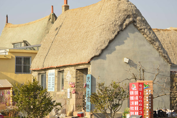 在成山卫镇烟墩角村前的海湾里,八九百只天鹅从早到晚总是愿意聚拢在距离人群只有几米的水边,期待人们的投食,这里是人类和野生大天鹅距离最近的地方。这一如今已有400多年历史的古村落,岸边房子的屋顶是用海草做的,一幢一幢海草房,用花斑彩石或青砖混合垒墙,高高隆起的屋脊堆满厚厚海草,上面罩着绿色渔网。据村民介绍,这种古老的民居冬暖夏凉,好处很多。别具风情的古村与海湾里游来游去的雪白天鹅相映成趣,远远看去像一幅美丽的油画。