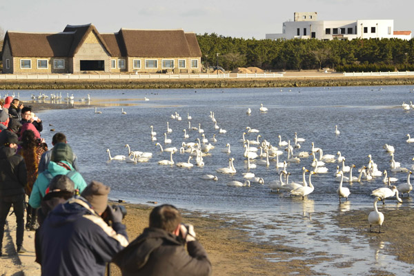 野生天鹅本来是惧怕人类的,但是由于当地对天鹅保护、喂食、救助和环境改善,天鹅与当地百姓和旅游者越来越亲密,从十多年前距离人群的500多米到如今的10多米。