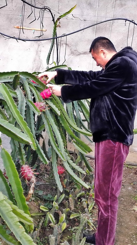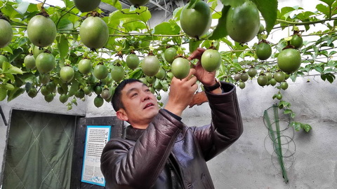 蓝湾生态蔬菜园有限公司总经理栾平东在查看准备春节上市的百香果。鞠传江 摄影