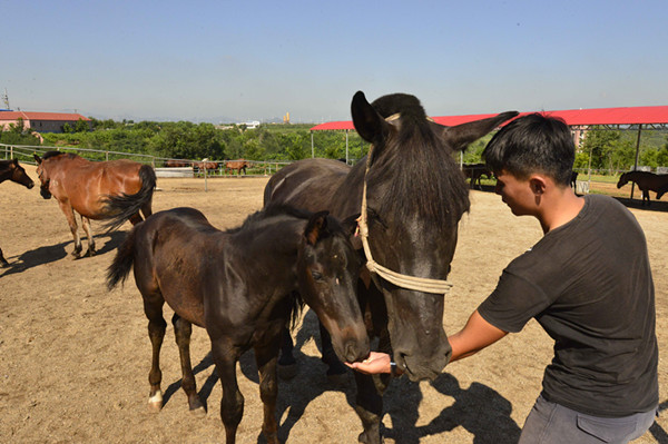 走进胶东半岛蓬莱市大辛店镇和圣马场,远远就看到他一手轻轻抚摸着一匹渤海母马,一边说着什么,刚出生不久的一匹纯种温血小马在欢快地来回跑着。