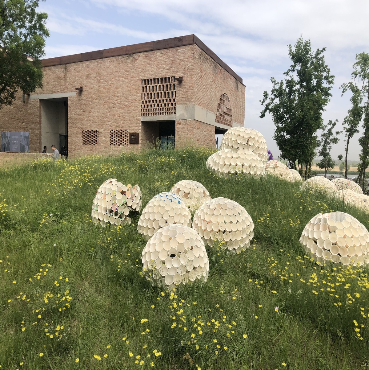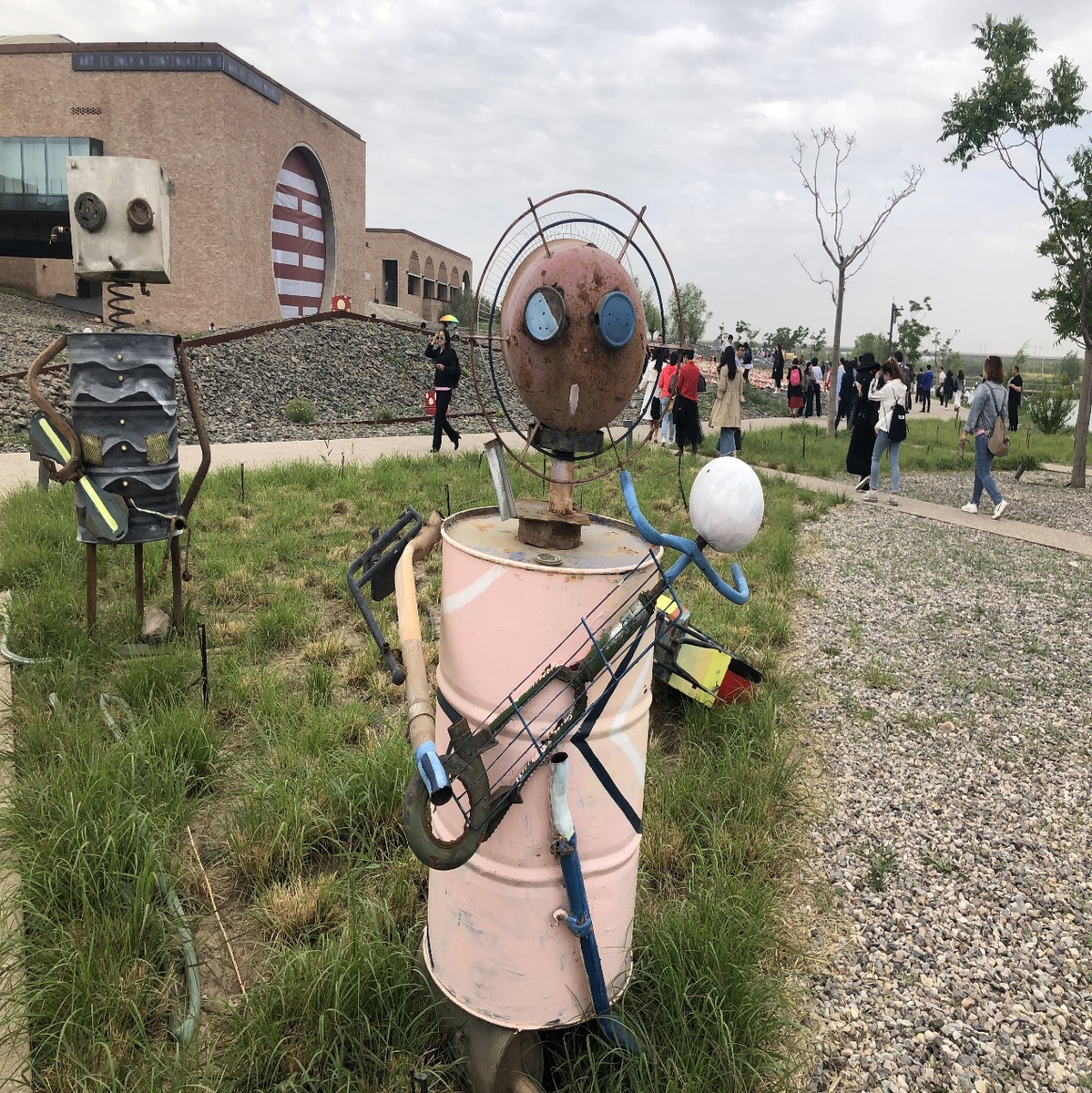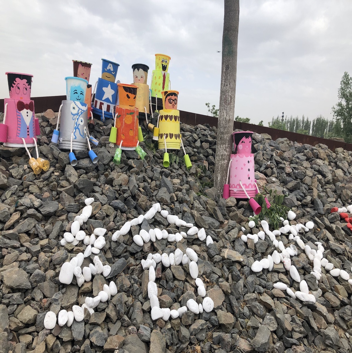 室外装置展区,回民二小的山河赤子们师生们用他们独特的视角和理念用一个一个废旧物品创作了一群群展翅欲飞的动物,自言自语的娃娃,在贺兰山下、黄河岸边亲近着这山、这水。
