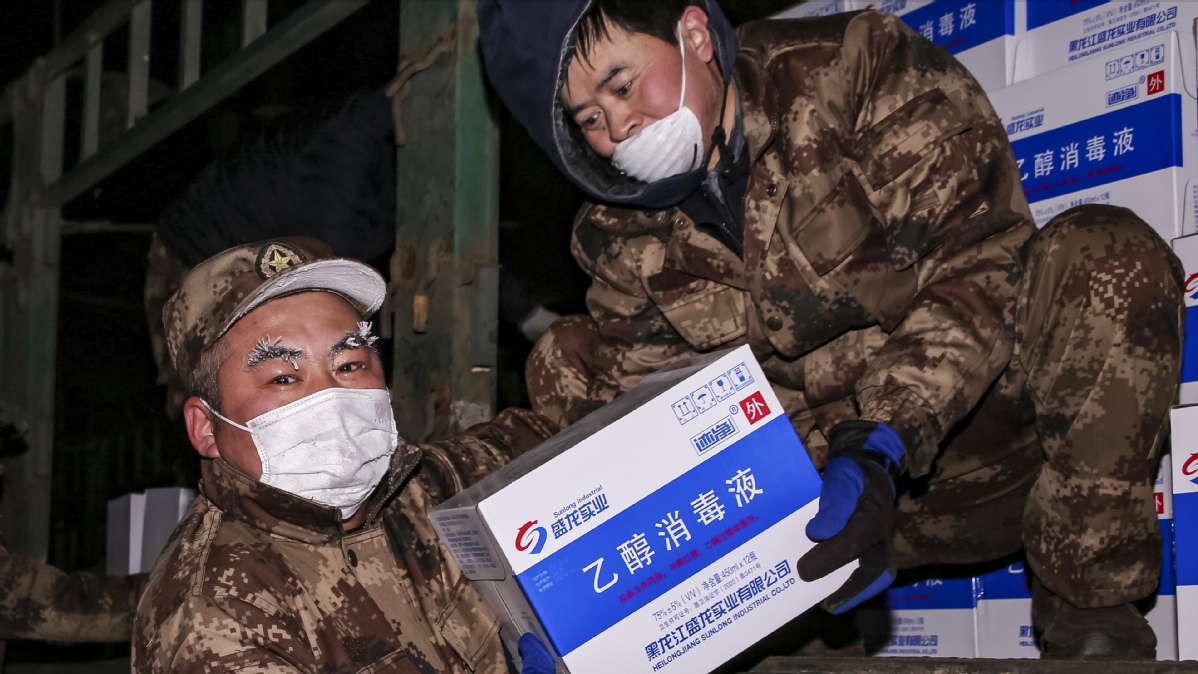 (图为哈尔滨市民兵执行抗疫物资搬运任务。宋岩摄)