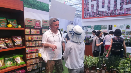 (每年的温州花博会都吸引着国内外众多商客前来观光洽谈。图为外国友人正在与花农洽谈商务。摄影:林锡忠)