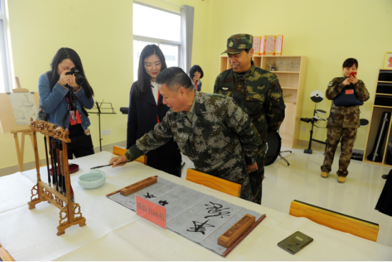 (图为作者在火箭军某旅战士文化室里题字。摄影:王杰)