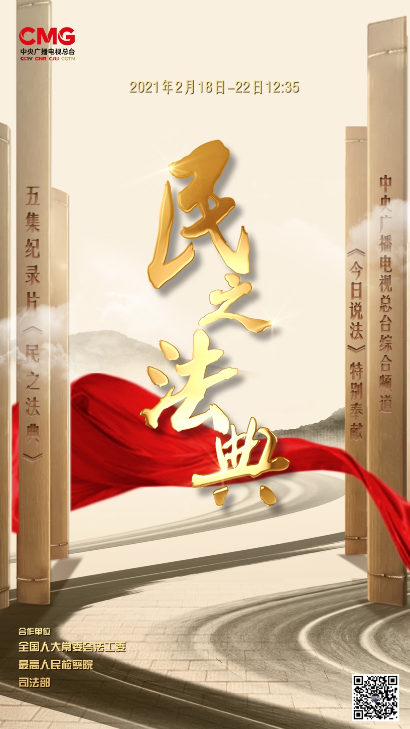 全国人大常委会法工委、最高人民检察院、司法部联合推出,中央广播电视总台综合频道《今日说法》栏目特别奉献的五集纪录片《民之法典》,汇集全国顶级法律专家资源,以真实案例为切入点,从时代、国家、社会、家庭、个人五个维度阐释《中华人民共和国民法典》(以下简称民法典)与人民生活的密切关系和深远影响,2021年2月18日至2月22日在中央广播电视总台央视综合频道播出,引发社会强烈反响。