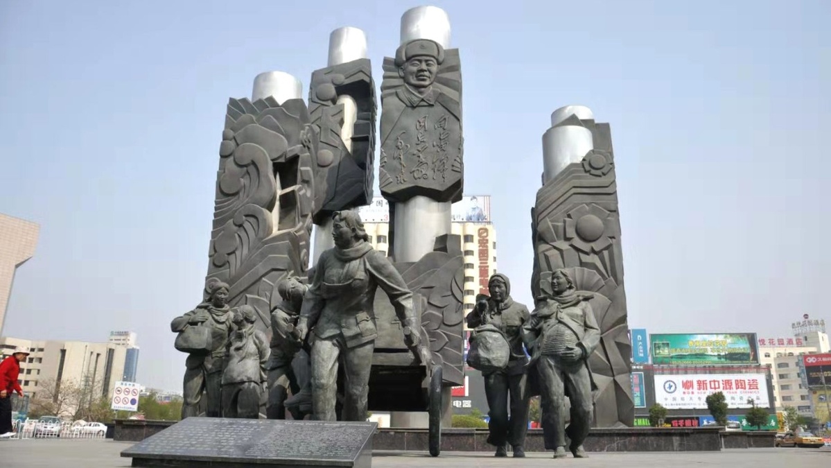 在连云港市区的龙河广场,我看到一组群雕:一位姑娘双手紧握平板车把,车上坐着老人和孩子;还有几位车手或搀扶孕妇、或手提包裹。