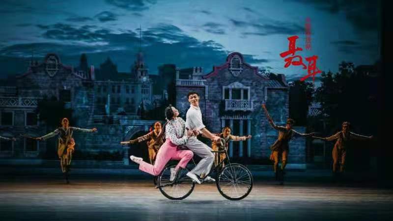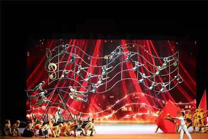 《聂耳》以融合创新的形式在解码代际区隔中寻求共同审美趋向,以跨时空的流行元素唤起不同年龄层的青春记忆。在舞台呈现上,突破了杂技视觉艺术的传统定位,通过以符号性杂技技巧为“点”,以剧目故事为“线”,以多艺术元素融合为“面”,通过“点”串“线”,拓宽剧目呈现的“面”,来丰富剧目的表达,因此,在杂技技术上创新了“倒立小顶拉提琴”、“蹦床飞竿”等高难度技术技巧,在舞台呈现上还创新了“五线谱”、“大型古筝”“移动蹦床”等新型道具,最终完成剧目在舞台上的立体呈现。在相对有限的时间篇幅里,传递出极强的艺术高度和极致震撼的精神亮度。