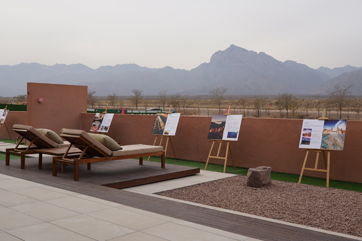 在方案设计的过程当中我就很在意这一块,当时我带着团队搭了2个这种项目的斜对角,搭了2个观光的平台。模拟从一层、一层半、二层、二层半不同的高度看贺兰山,其实就是想模拟游客从将来的客房里面的感受和将来在公共空间消费的感受,我们发现视野越高,看山的感觉更好。这个是一个非常、独一无二的视野。现在我营造出的半山视野,感觉好像更能够触及人的内心。