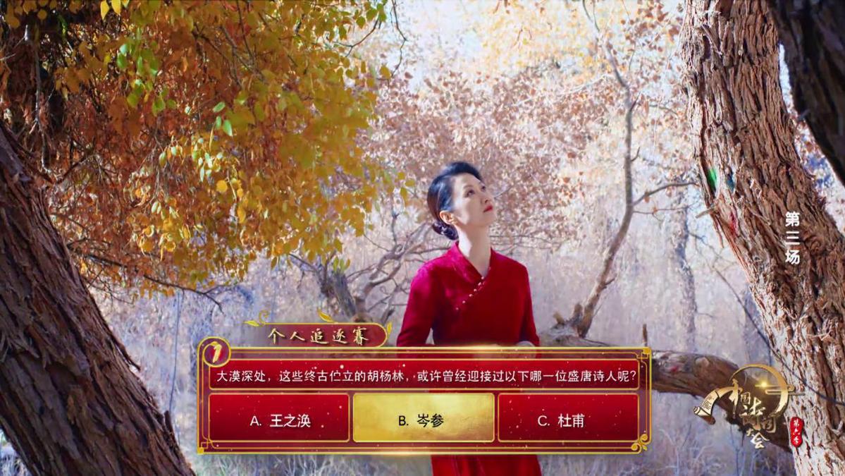又如杨雨老师在戈壁身着一袭红裙,骑着骆驼走进树叶金黄的胡杨林中,边走边出题。千百年来,胡杨林就像沙漠卫士一样,保卫着沙漠的生命线,唐朝诗人怀抱“宁为百夫长,胜作一书生”的理想,投笔从戎,奔赴塞外,谱写了诗歌史上最为雄健的边塞乐章。大漠深处,这些终古伫立的胡杨林,或许迎接过哪一位盛唐诗人呢?她解释岑参足迹遍及河西走廊和今天的新疆腹地,他才有可能亲眼见到胡杨林。节目通过身临其境出题,既展现了祖国河山的壮美如画,又体现了“行万里路读万卷书”的情怀,更加深了观众对古诗词的理解。