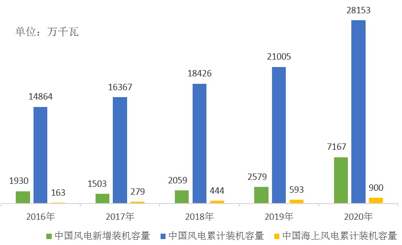 “十三五”期间,全国风电爆发式增长,风电建设投资超过7000亿元,2020年风电投资完成额达2618亿元,同比增长70.55%。提前1年完成了国家“十三五”规划的累计并网装机容量达到2.1 亿千瓦的目标。到2020年底,全国风电机组累计装机台数超过15万台,风电累计装机28153万千瓦,同比增长34.6%。其中陆上风电累计装机2.71亿千瓦、海上风电累计装机约900万千瓦。据国家能源局新能源和可再生能源司副司长任育之介绍,“十四五”期间国家风电行业发展将比“十三五”更快更好,将加快推进“三北”地区陆上大型风电基地建设和规模化外送,同时推动近海规模化风电基地发展,推出一批深远海风电示范项目,坚持陆上风电与海上风电并举,集中式与分散式协调发展,电力本地消纳与超高压远距离输送相结合。按照规划,今年全国风电、光伏发电发电量占全社会用电量的比重达到11%左右,后续逐年提高,到2025年达到16.5%左右。