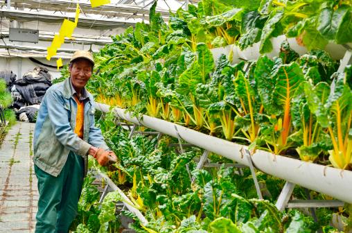 白朗县蔬菜示范园里的藏族职工在管理立体栽培的蔬菜。(鞠传江 摄)