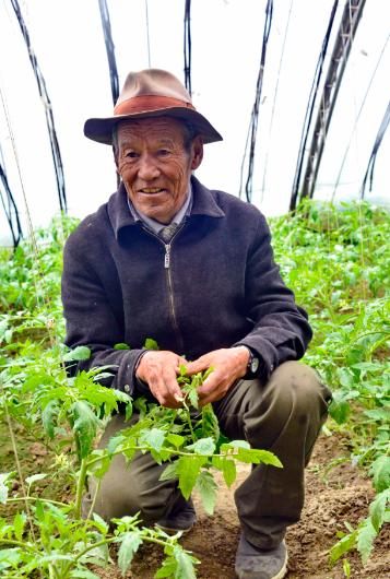 白朗县巴扎乡彭仓村70多岁老支书边巴顿珠正在自己家的蔬菜大棚里给刚开花的西红柿打杈。(鞠传江 摄)