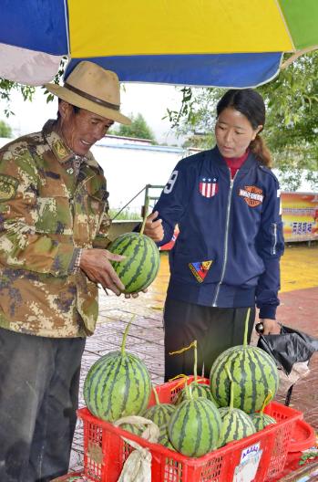 "山东来的‘老张’来手把手地教我们种菜,村民们也逐步尝到种菜的好处,现在村里每家都种植了蔬菜大棚。西瓜可以卖到10元钱一斤,种菜使我们的日子越来越好啦!” 边巴顿珠说。