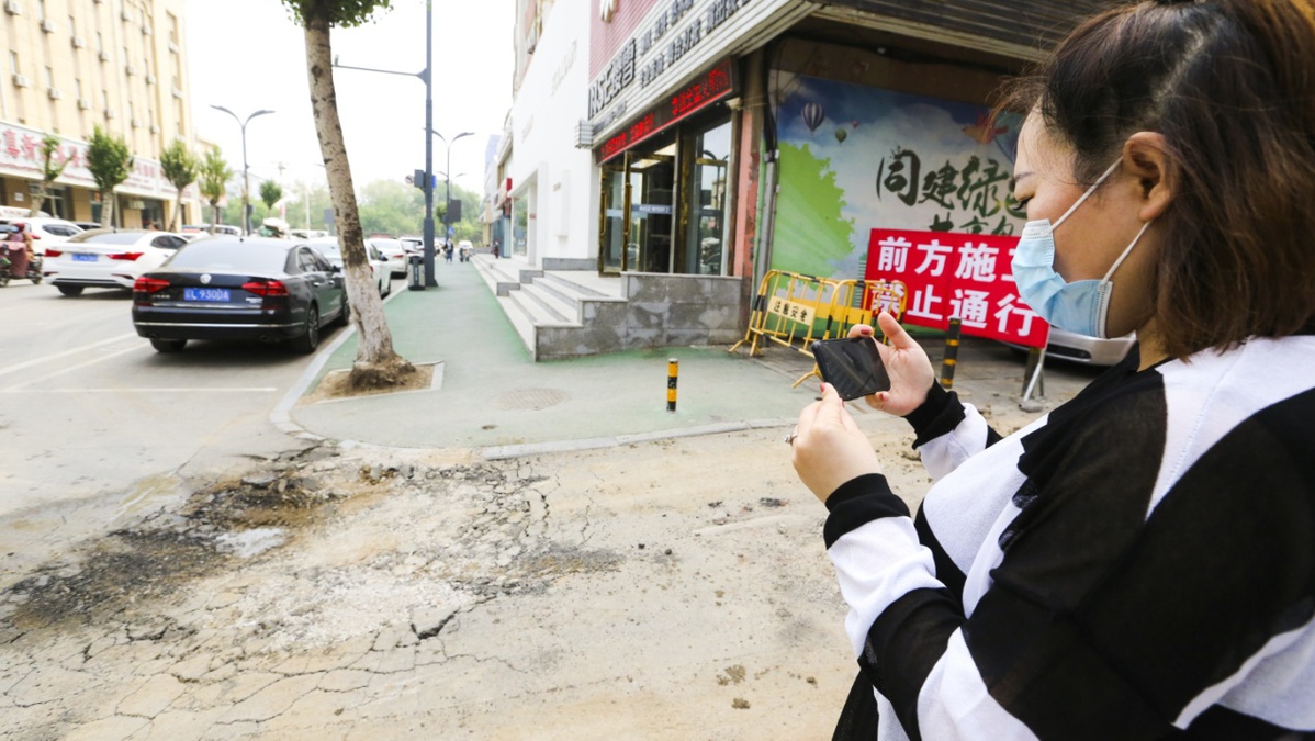 2021年9月16日,出门办事的渤海街道景园社区居民彭闪闪,看到路边步道上的水泥砖出现了破损,拿出手机拍了两张照片,附上说明文字,然后手“随手拍”app上传。彭闪闪说,“用不了多久,就会把问题的处理情况回复给我。”