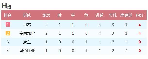 下半场,双方又各进一球,最终打成2-2,日本队也成为亚洲球队中唯一两战没有败绩球队,当之无愧地成为亚洲球队的领头羊。两战过后,日本队以1胜1平的战绩力压塞内加尔高居小组榜首,他们也成为亚洲球队中唯一的小组第一名。