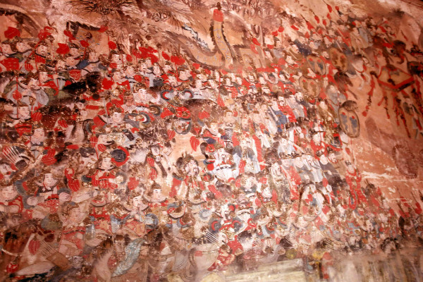 位于登泰山起点的岱庙,具有皇家宫城气派,岱庙主殿天贶殿内墙壁上绘有巨幅壁画,名《泰山神启跸回銮图》,长62米,高3.3米,画面宏大,仅人物就达675人。古代皇帝所栽的古柏下则是他们留下的石碑,现存历代碑刻200多座,成为中国三大碑林之一。