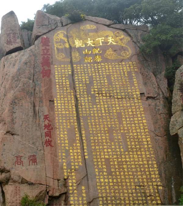 最为震撼的是泰山之巅的《纪泰山铭》,这是1200多年前唐玄宗李隆基的“封禅”祈天之文,也是第一个把祭天颂词公布于世的皇帝。摩崖碑高13.3米、宽5.2米,1000多个镏金大字在太阳照射下闪闪发光。