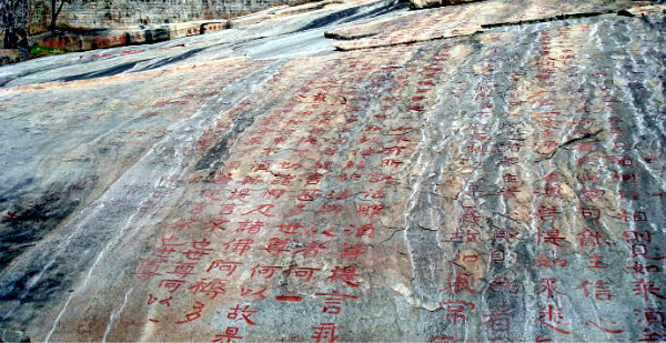 泰山经石峪,至今保留着1500年前北齐(555~577)时期的高僧安道壹所书的《金刚经》石刻,隶书经文刻在约三千平方米的大石坪上,现仅存1067个经文石刻,其余1400多字,已经被风化和流水冲刷掉了,这是中国现存规模最大的佛经摩崖刻石,为历代书法家所尊崇。令人感叹的是经文在夏日里会有溪水从经文上面漫过,水冲击经文会发出叮咚悦耳之声,使人进入佛教的神秘气氛之中,妙不可言。