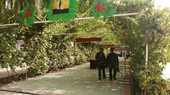 但是,走进执勤二中队的军营,我却被一片翠绿惊得目瞪口呆:高高的葡萄架、成排的白杨林、连片的蔬菜园……曾任执勤二中队中队长、现任武警兵团总队侦察处处长的罗兴国告诉我,这里是千里戈壁大漠中的“十亩江南”。