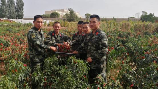 (图为官兵们在自己的菜园里采摘辣椒场面。杨应森摄)