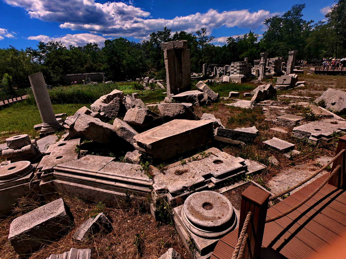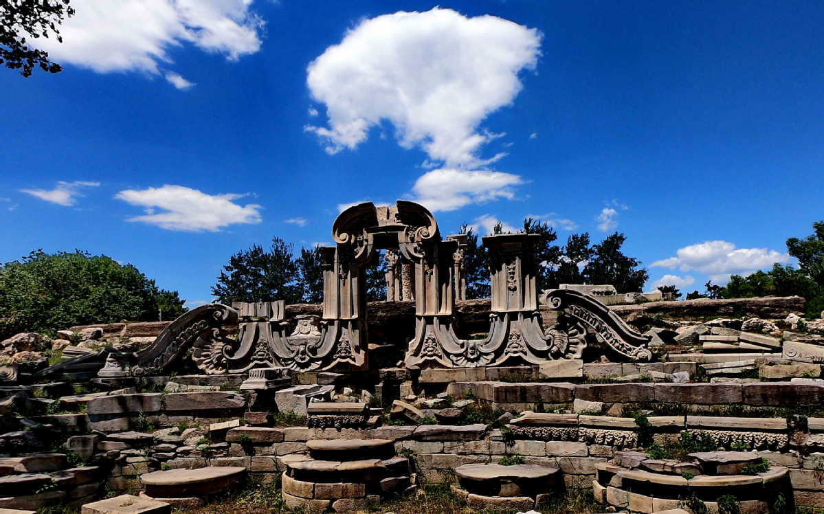 曾经的万园之园,留存的历史建筑已经寥寥无几,一座座残桥、一个个废墟被空旷的湖水包围着,最显眼的是圆明园的欧式建筑大水法的雕刻石门和断碎的罗马石柱,虽经160年风雨依然悲壮地傲立着,年复一日,朝霞和晚霞总是给它涂上一层绚丽的色彩,洁白的汉白玉石柱变得奇光闪烁,如同火焰跳动。