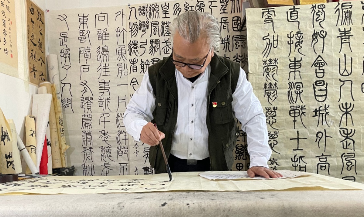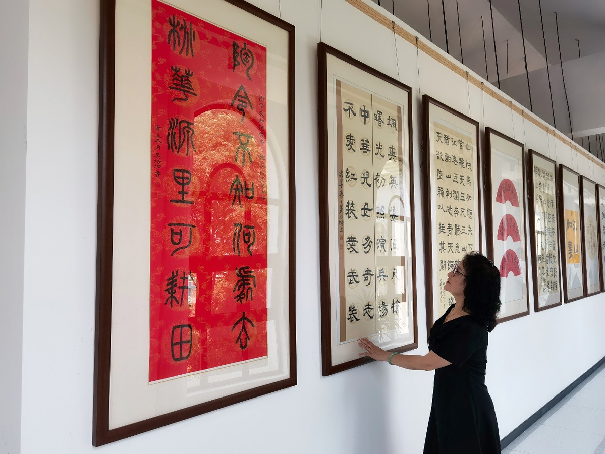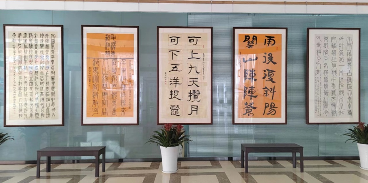 书法作品由未央区书画协会副主席吴培坤展出,内容以毛主席诗词为题材,共60幅。书体以篆、隶为主,篇幅丰富多彩、形态各异,笔意在传承基础上,有创新和个性,具有较好的欣赏性。