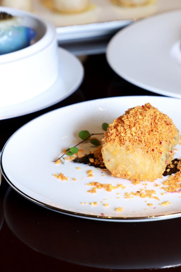 而论及求新求变,从传统虾饺中创新而来的翡翠玉龙饺令人拍案叫绝。韭菜汁制作出翡翠色的饺子皮,紧紧包裹蓝龙虾肉和白海虾肉,上桌前以特别的食材点缀。一道最传统的中国美食,在色味意形上,都有了天翻地覆的改变。无论是酥脆蒜香智利鲈鱼柳,用避风塘技法制作,结合西式摆盘;还是一块小小的杏仁酥,把坚守95年的老店初心,展现得淋漓尽致。