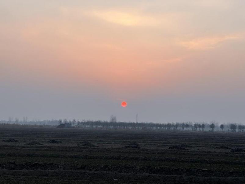 随着日头西斜,一条条蓝色白色炊烟在村庄中升起,乡间的灯火一家家亮起。结束采访驱车回家的路上,六岁的女儿让我靠边停车,抓拍下这张城市里难得一见的夕阳。