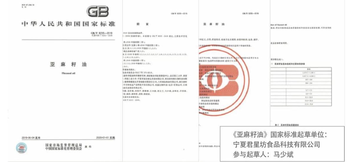 制定标准就是制定规则。积极参与新标准的制修订,该企业作为两个亚麻籽加工企业之一参与起草修订了《亚麻籽油》国家标准和《亚麻籽饼粕》行业标准。