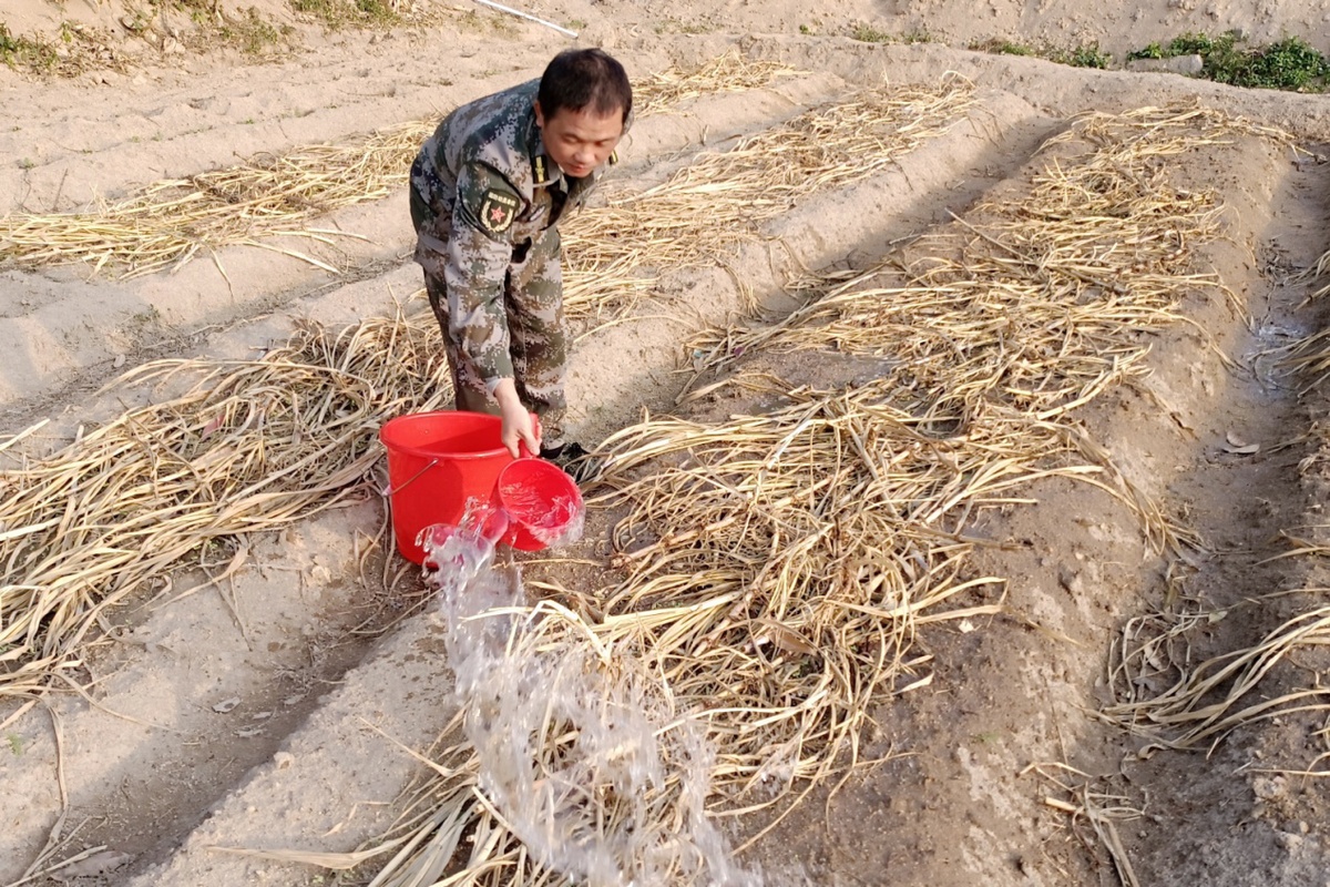 (图为郑燕武在哨所的菜园里为菜苗浇水。张泽锐 摄)