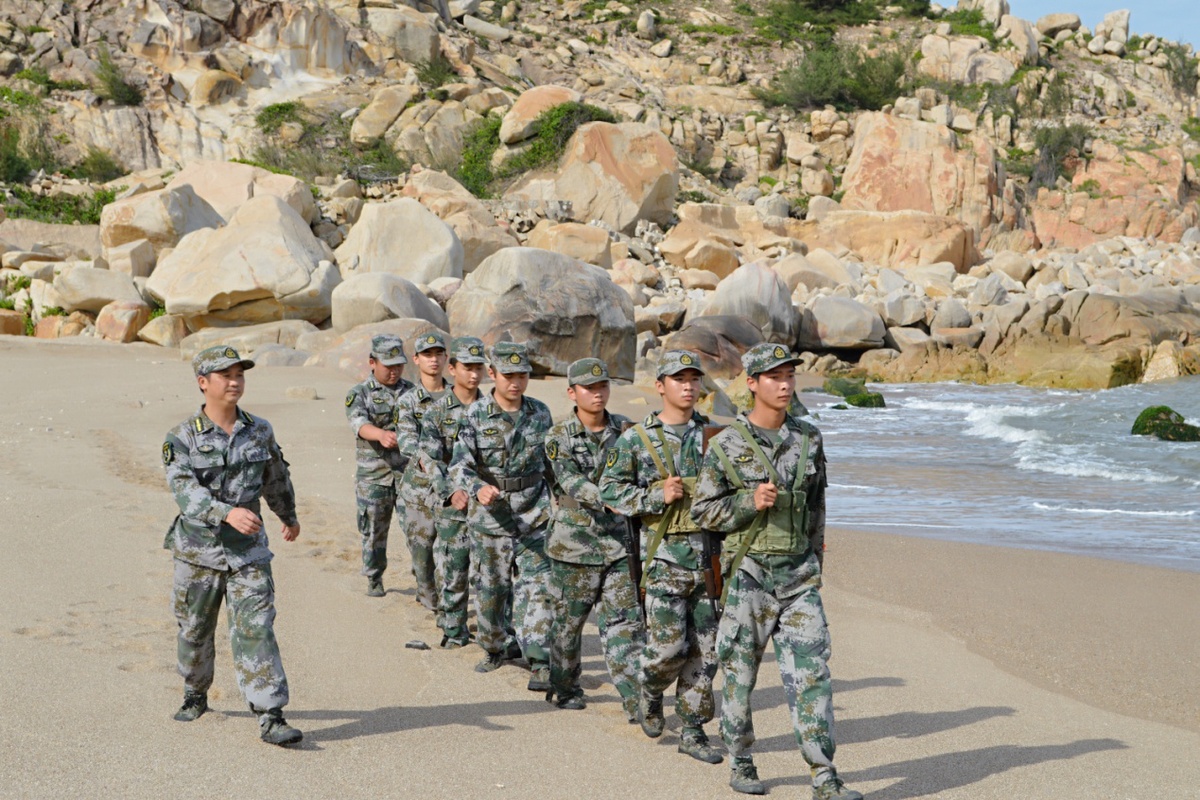 (图为郑燕武[左] 带领哨兵在海边巡逻。张泽锐 摄)