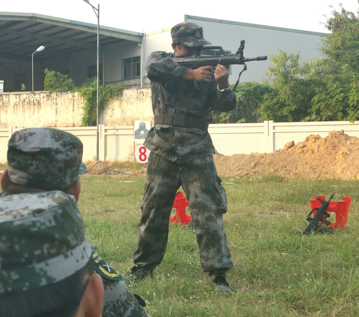 (图为郑燕武[右] 为哨兵们作射击动作示范。张泽锐 摄)