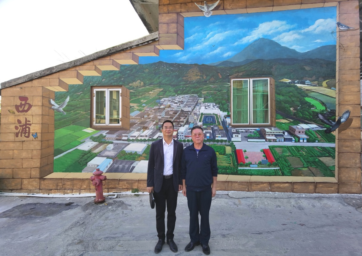 (图为驻西浦村第一书记余育群与作者在西浦村全境画前合影。)