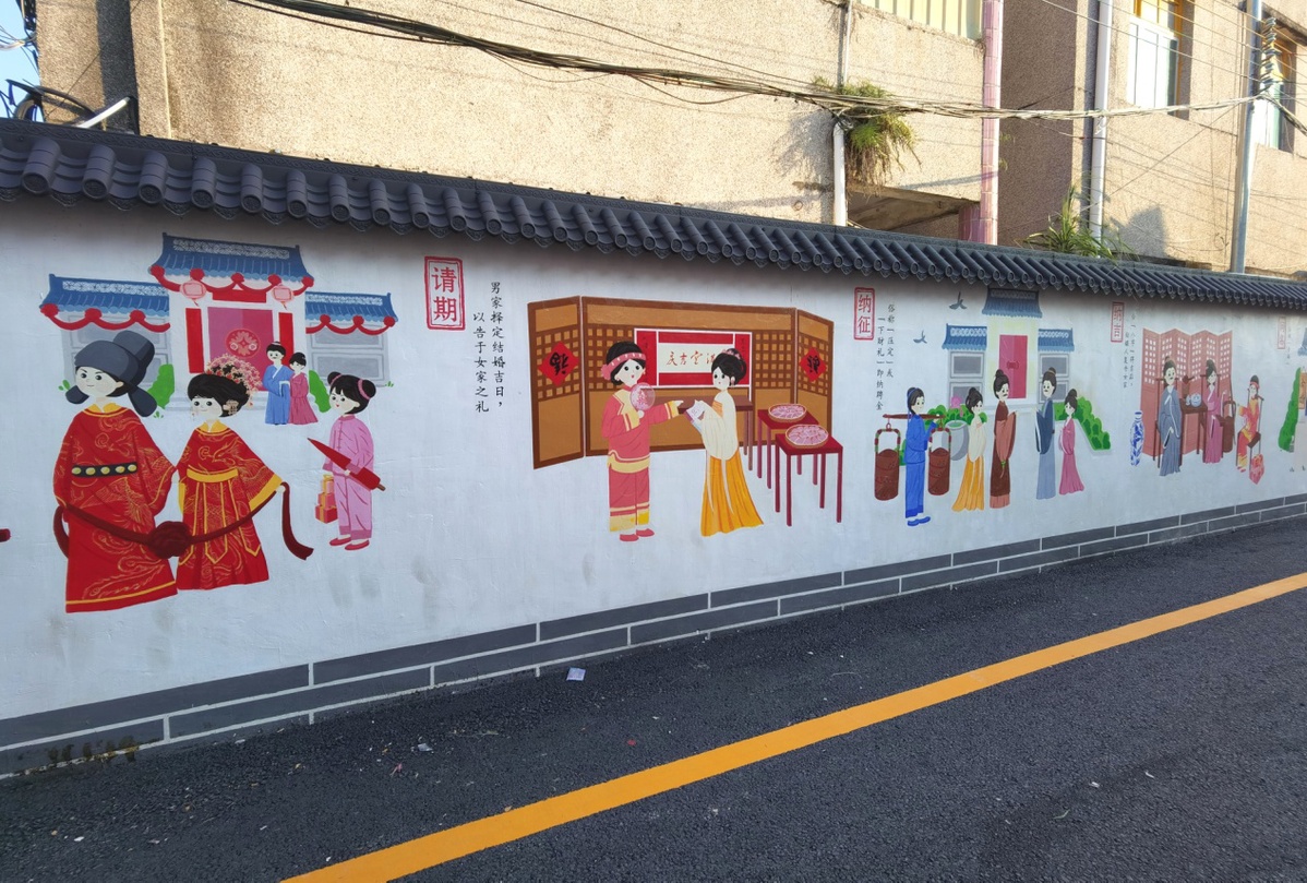 在古村落旁,修建新时代文明实践站,为村民提供理论、农技、法律知识等学习,党群服务中心左侧,打造了婚俗文化墙,让村民和游客对婚俗的了解和认知。