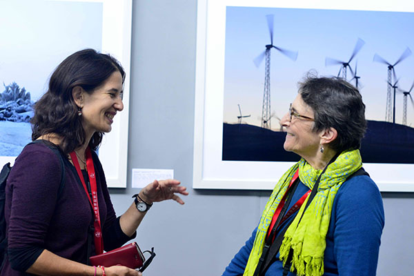 策展人苏珊.都利(右)和摄影师正在交流展览作品。鞠传江摄影