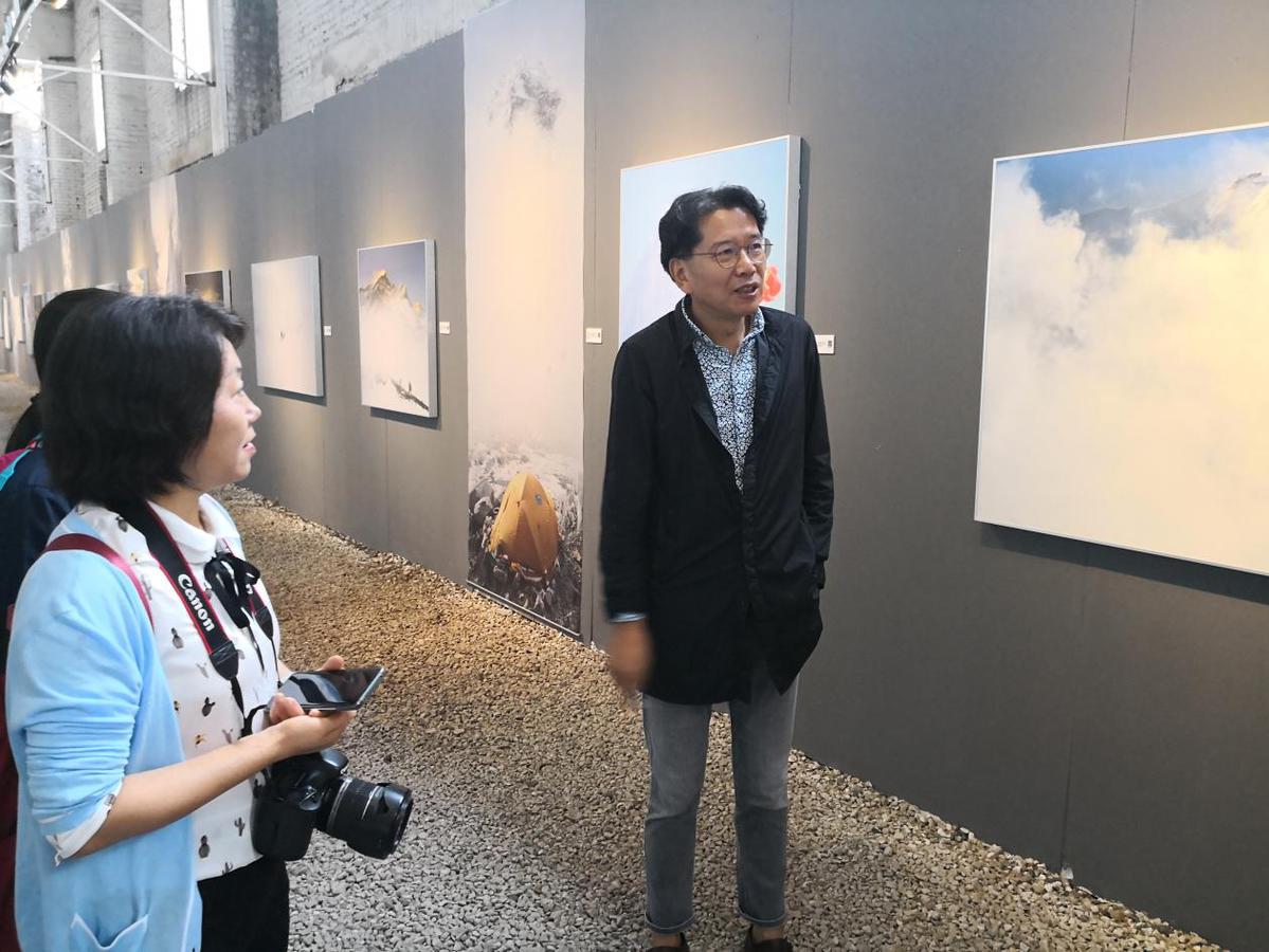龙江(右一)在《绝命海拔》展览前接待来访的摄影爱好者。