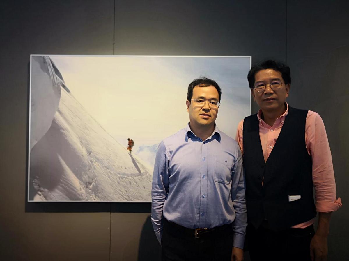 中国日报记者孙瑞生与龙江在《绝命海拔》展览前合影